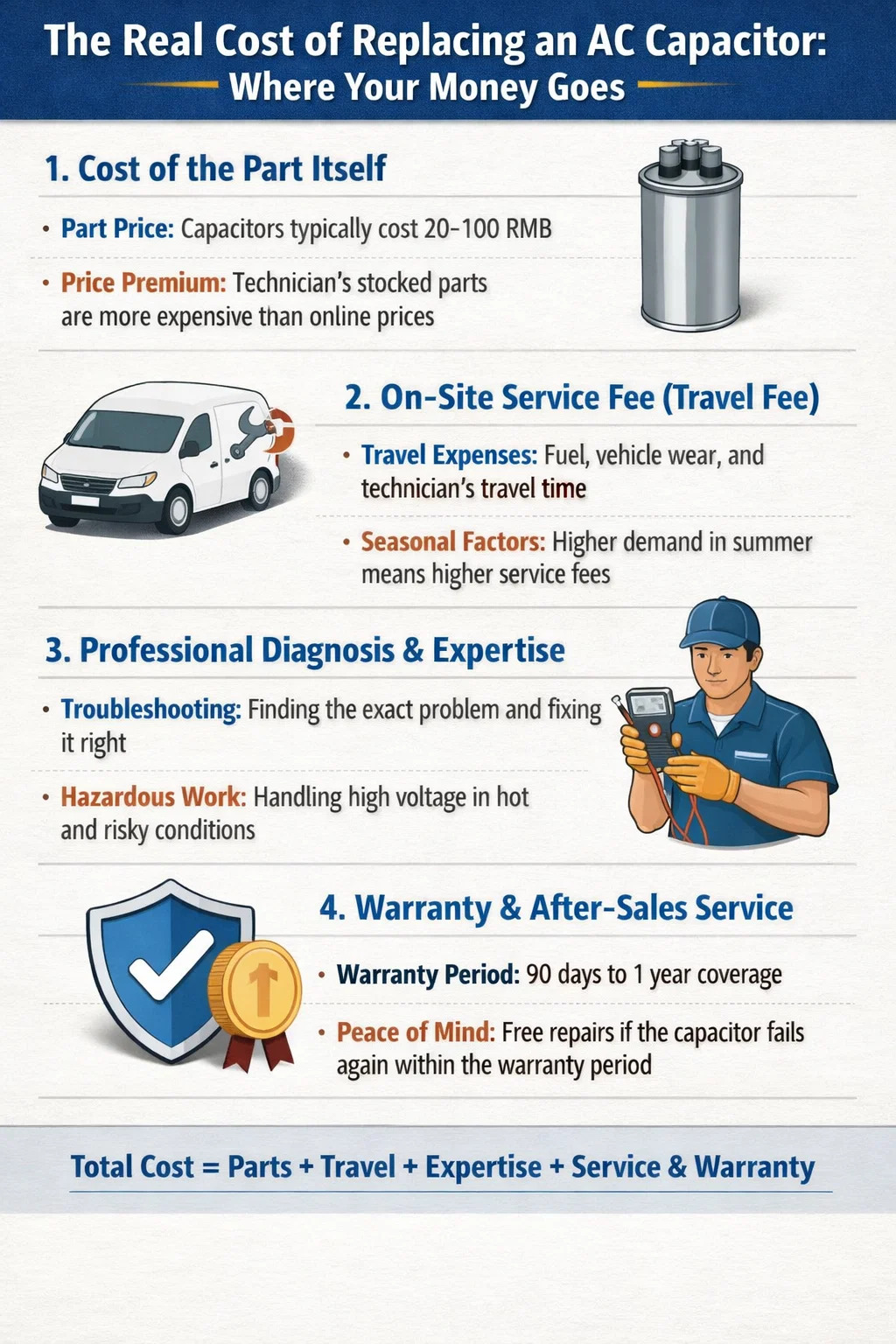 Cât costă cu adevărat înlocuirea unui condensator de curent alternativ? Mulți oameni văd că poti mici de metal se vând online pentru doar câteva zeci de yuani, dar factura reparatorului ajunge la câteva sute de yuani, lăsându-i neliniștiți.