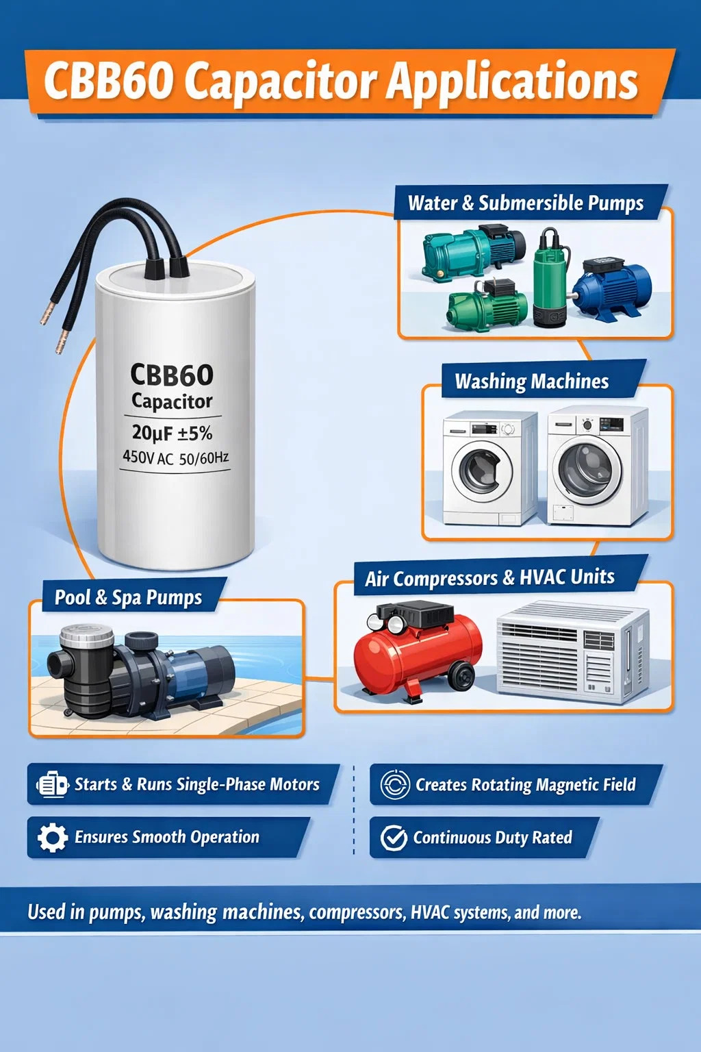 Condensatorul CBB60 apare într-o gamă surprinzător de largă de echipamente. În timp ce aplicațiile cu pompe domină piața, capacitatea componentei de a gestiona tensiunea continuă AC la frecvența nominală o face potrivită oriunde un motor monofazat are nevoie de ajutor pentru a crea o a doua fază.