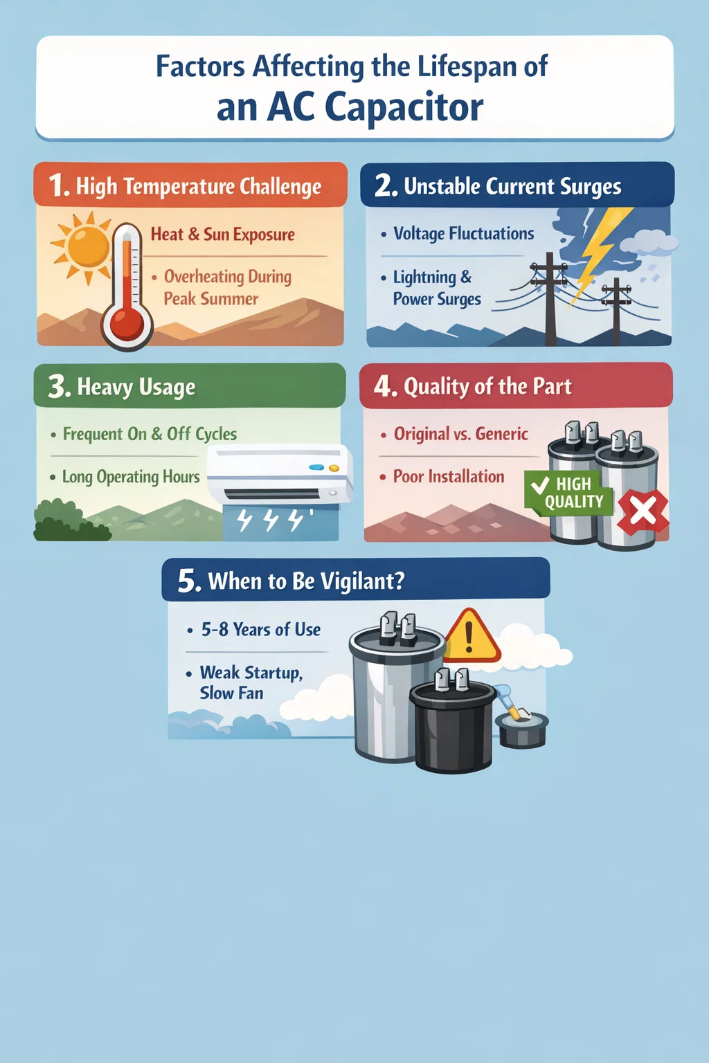 The five-to-eight-year mark: For most ordinary household air conditioners, the performance of the AC capacitor begins to decline after five or six years of use.